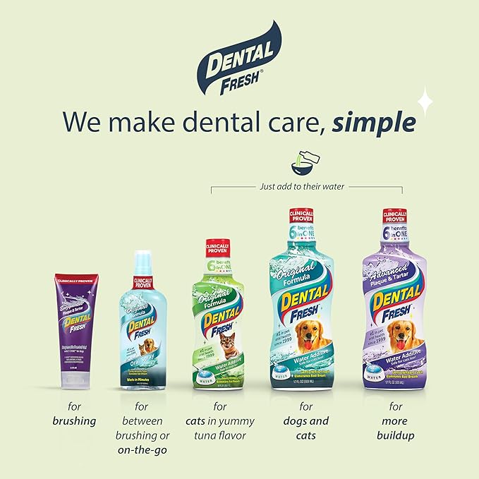 - TOOTHBRUSH IN A BOTTLE – A simple and fast way to help care for your cat’s dental health. Adding it to their water is like brushing their teeth with every drink. Cats love the tuna taste!