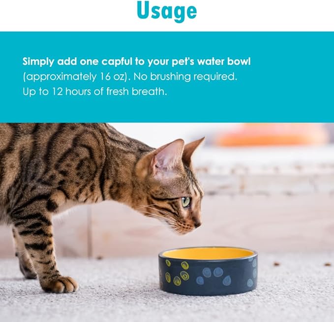 - ๐ฆท Ease of Use: Simply add one capful to your pet's water bowl (approximately 16 oz). No brushing required. Up to 12 hours of fresh breath.