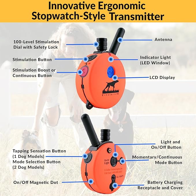 - Includes 2 Biothane dog collars (1" wide x 30" long), 2 RX-120 large receivers (2.7" long x 1.7" wide x 1.2" high, 4 oz.) and 1 ergonomic "stopwatch" transmitter (2.75" diameter x 1.2" thick x 4.6" high) well-suited for small hands or in situations where discretion is important