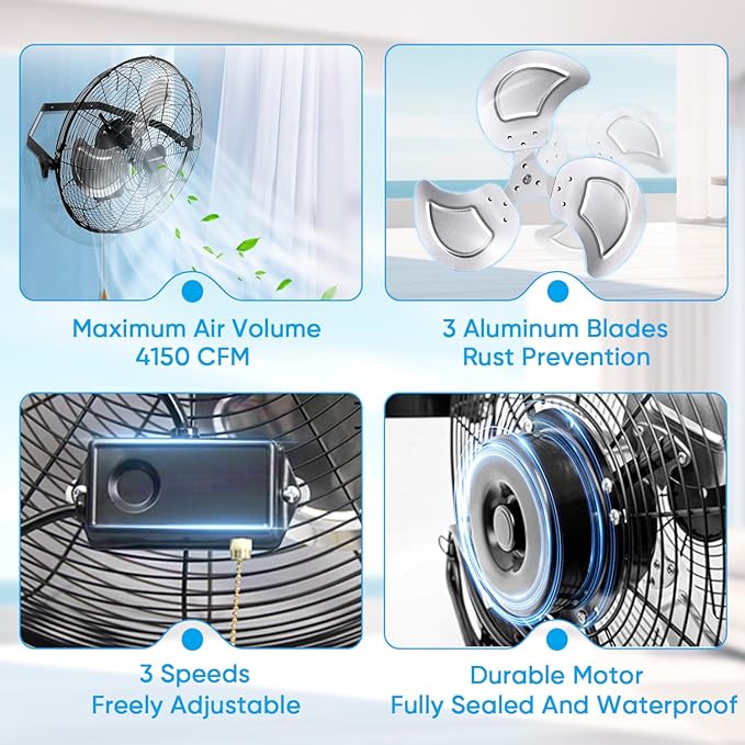 - 【SUPERIOR PERFORMANCE】Wall Mounted High Velocity Fan, 3-Speed adjustable with pull chain control featuring three different speeds,full sealed motor produce up to 4012 CFM of airflow, 7.3m/s air speed; powerful and strong ventilator.The pull chain is 60 centimeters which is very convenient for you to control the industrial fan.