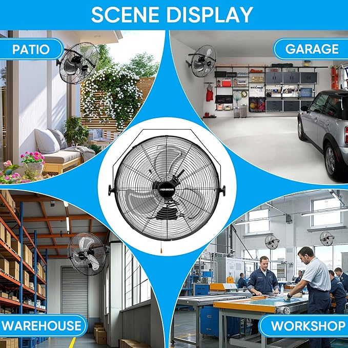 - 【EASY ASSEMBLY AND USE】Easily mounted with the included heavy duty wall bracket and hardware. Ideal for home, patio,greenhouses, garages, workshops and other areas that may need a heavy duty wall fan