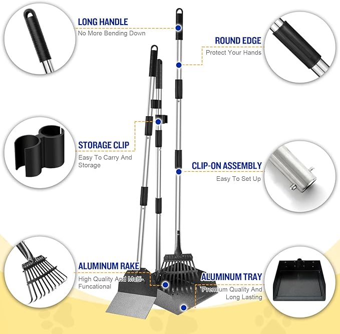 - ★ DURABLE AND LIGHTWEIGHT - Handle is made of premium stainless steel, tray, rake and spade are made of aluminum material, this poop scooper is super sturdy, resistant to rust and dirty, but lightweight to hold along your walk with your furry friends.