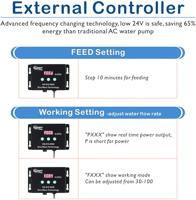 - Easy to Read External Controller -- Build in external controller, easy to operate, offers up to 71 speed setting for you to customize water flow and feeding setting ( turn the pump off for 10 minutes for feeding). Easy to read red Led display