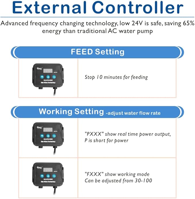 - Easy to Read External Controller -- Build in external controller, easy to operate, offers up to 71 speed setting for you to customize water flow and feeding setting ( turn the pump off for 10 minutes for feeding). Easy to read red Led display