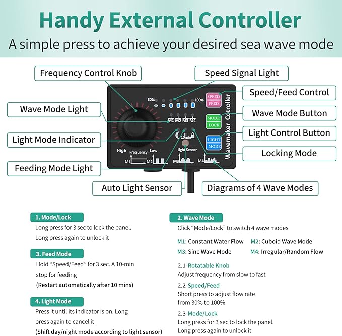 - 4 Optional Waves: Press the “mode” button to switch between 4 wave modes (M1/M2/M3/M4). Easily achieve multiple sea waves with a simple controlling panel.