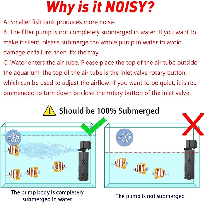 - QUIET WORKING - The sound level is less than 40 DB when the fish tank working This silent fish tank filter is internal noise reduction, external silicone cushioning suction cup, reduces noise, and lets the family enjoy a quiet life.