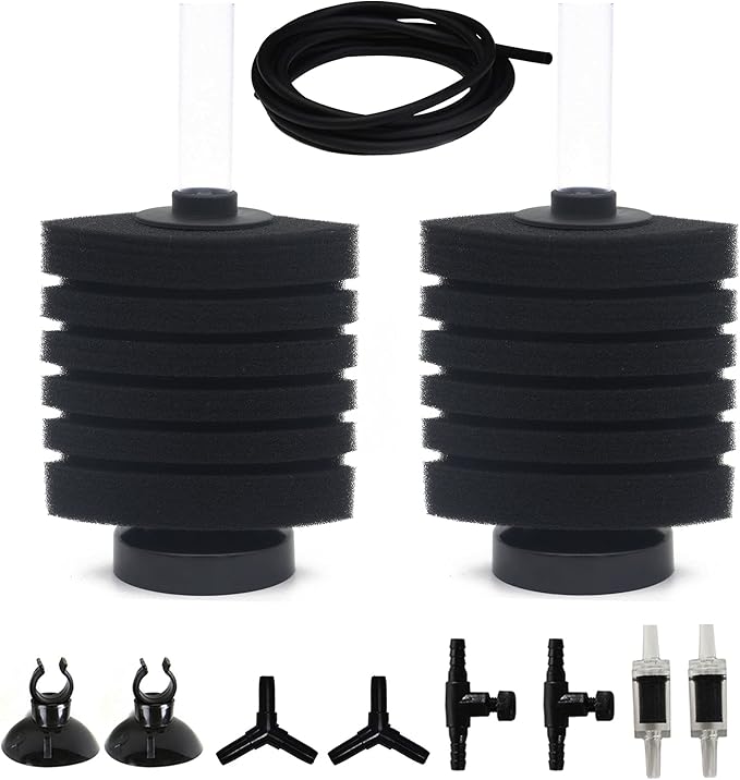 - Includes: 2 Pcs Sponge Filters, 1 Piece of 8 Feet Black Standard 3/16" Airline Tubing, 2 Pcs Aquarium Air Control Valves, 2 Pcs Check Valves, 2 Pcs Suction Cups, 2 Pcs Y-shaped Connectors