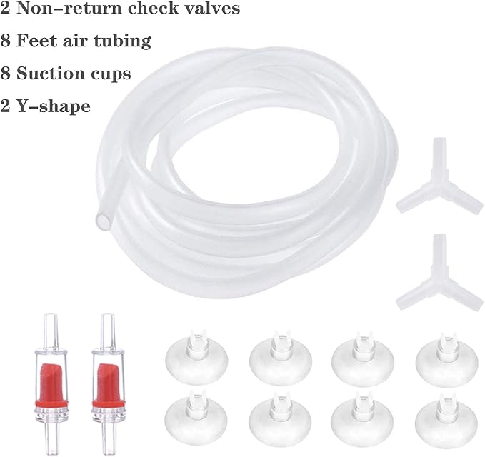 - Includes: 2 Pcs Sponge Filters, 1 Piece of 8 Feet Clear Standard 3/16" Airline Tubing, 2 Pcs Check Valves, 8 Pcs Suction Cups ,2 Pcs Y-shaped Connectors