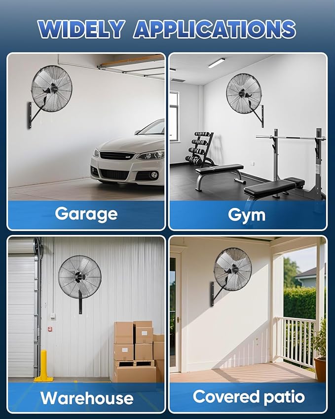 - Durable and Versatile Design. Built for heavy-duty use, this wall-mounted fan is perfect for industrial settings, auto repair shops, and commercial spaces. Its 20-inch size and oscillating feature provide wide coverage, ensuring consistent airflow across the room.
