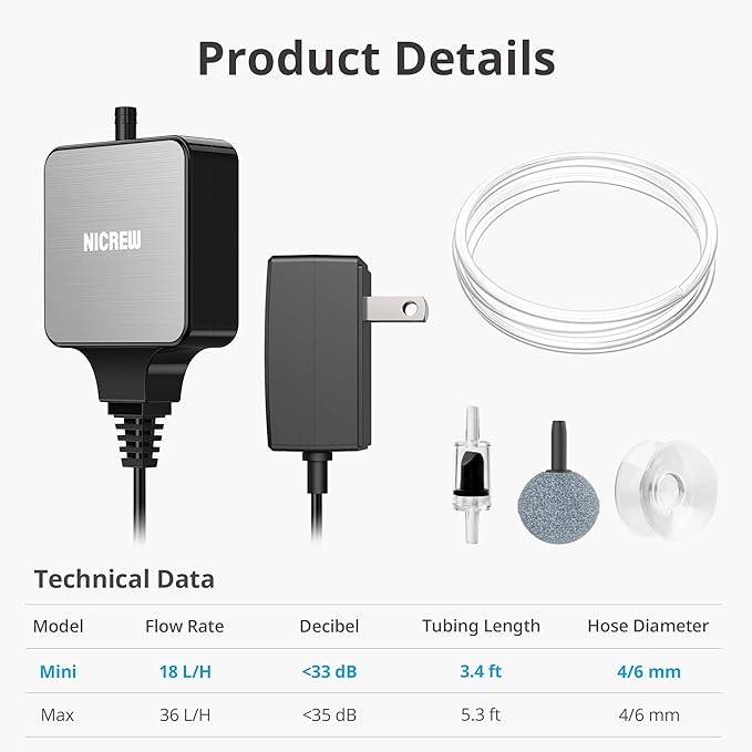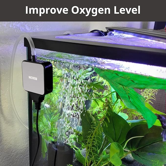 NICREW Nano Silent Aquarium Air Pump Black, Aquarium Aerator with Accessories for Up to 10 Gallon Fish Tank, Super Quiet, 0.3 L/min, 1.5 Watts