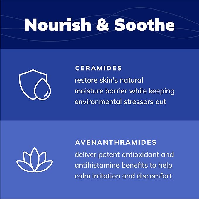 - 𝐏𝐫𝐨𝐦𝐨𝐭𝐞𝐬 𝐒𝐤𝐢𝐧 𝐁𝐚𝐫𝐫𝐢𝐞𝐫 𝐈𝐧𝐭𝐞𝐠𝐫𝐢𝐭𝐲 - Enriched with ceramides and avenanthramides to help calm itching and irritation, restore moisture, and support the skin’s natural immune system.