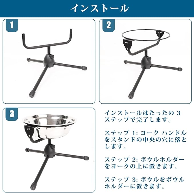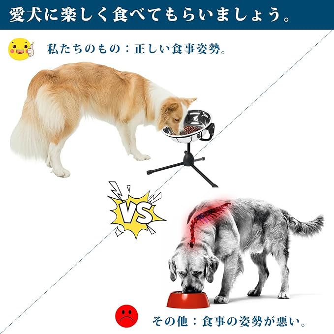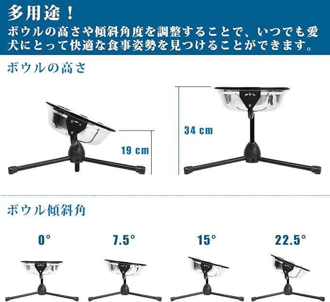 - 【Metal Stand & No-slip Design】This dog bowl set includes a metal stand which is sturdy, durable, and rustproof. The long legs of the tripod stand make the unit more stable. The rubber caps at the ends of the legs prevent the elevated dog bowl stand from moving around on the floor. The plastic tubes on the bowl holder prevent the dog food and water bowl from moving while the dog is eating or drinking. The product is not dog dishes for small dogs, but stainless steel pet bowl for extra large breed.
