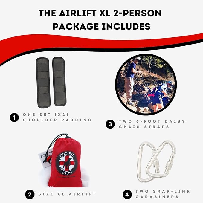 - FITS EXTRA-LARGE DOGS (70-160 LBS): The Fido Pro Airlift XL-2, for dogs 17-24 inches in length, includes anchor points, daisy-chain straps, carabiners, and shoulder padding, allowing a second person to assist in carrying over tough terrain.