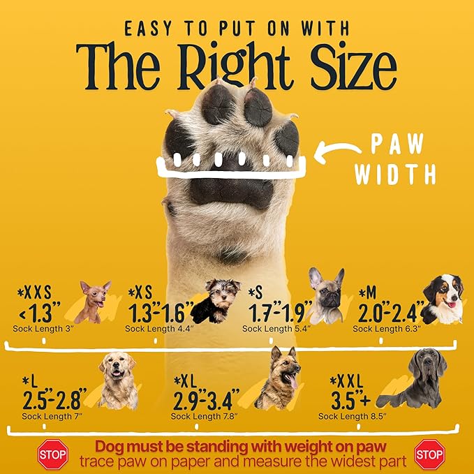 - Medium fits paws 2" - 2.4". Measure while dog is standing with weight on paw. Includes 4 dog grip socks. Snug fit is normal—extra grip makes them stiffer than other socks but provides better traction.