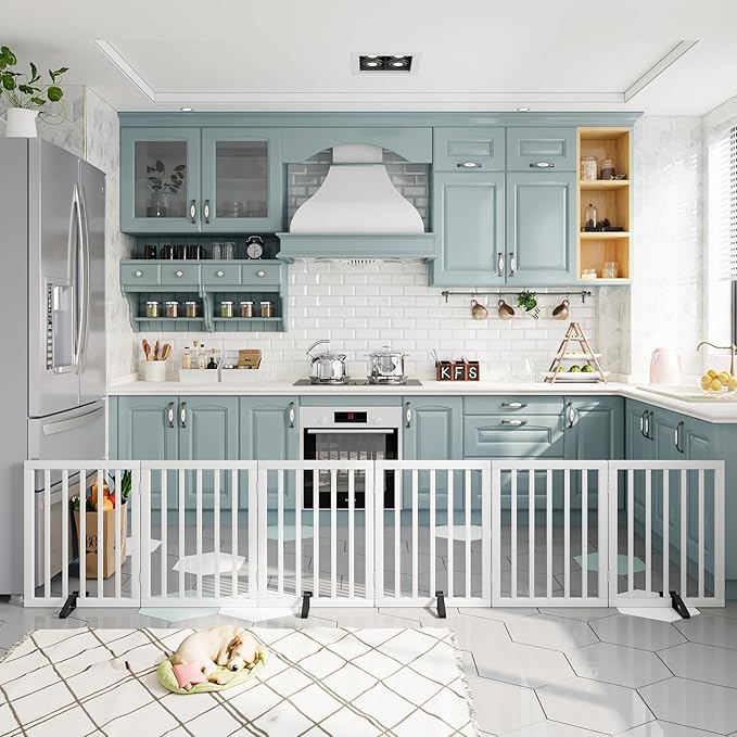 Dog Gates for Doorways Extra Wide 110inches (9ft), Wooden Freestanding Pet Gates for Dogs with 4 Support Stands, Foldable Gates for Dogs Indoor