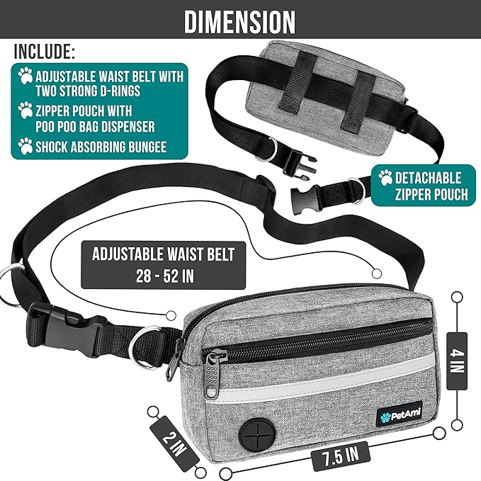 - AROUND THE WAIST DOG LEASH FOR RUNNING: PetAmi Dog walking fanny pack reinforced an extra padded bungee cord leash handles for superior grip and control while you are jogging, walking or training dogs. Our wearable hip dog walking bag also features a safety reflective trim on its front ensuring both you and your dog are easily visible to others, enhancing safety and visibility. Enjoy the perfect blend of security and comfort with PetAmi waist belt bag with dog leash for large dogs.