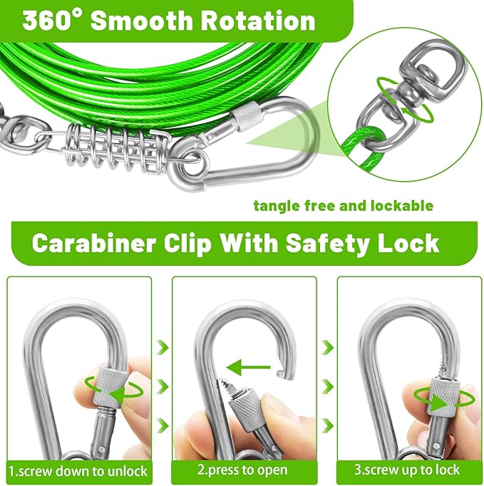 - THE NEWTEST CLIP: The rotating clip can rotate 360 °, and the clip is fixed with a ring at the bottom,so that the dog leash will not fall off the hook easily. Provide more space for dogs to move without entanglement. The screw on the swivel hook can lock it to prevent your pet from escaping from the cable and running to dangerous places. pet from breaking free of the cable and running into harm's way.