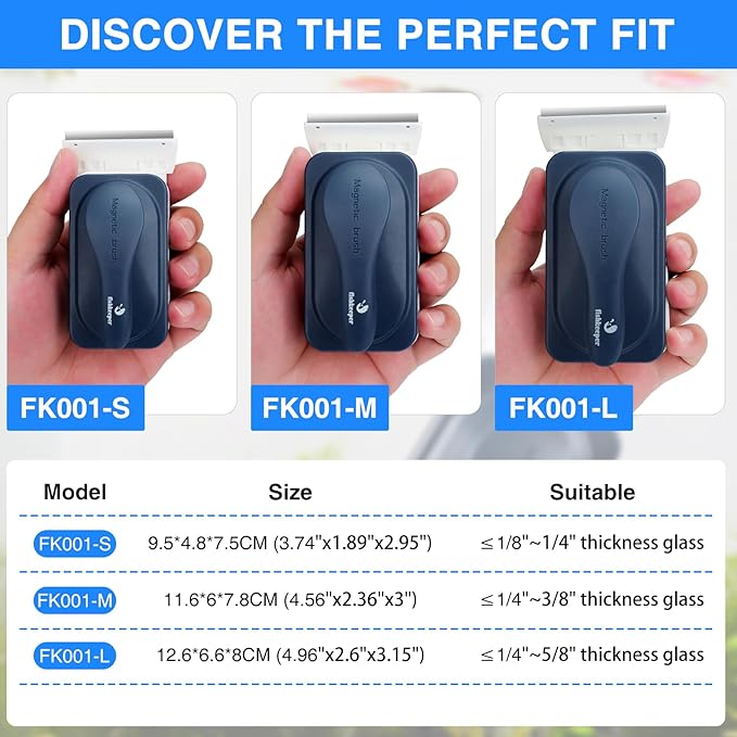 - Super Strong Magnetic Force for Quick Aquarium Cleaning: Our fish tank magnetic brush features a strong magnetic force that securely adsorbed to tanks without the risk of detachment. Designed to fit aquariums with a thickness of 1/4"~5/8"(0.25-0.625in) inches, whether you're removing stubborn dirt or adjusting aquatic plants, our aquarium glass cleaner stays securely in place, making your cleaning tasks more efficient and effortless