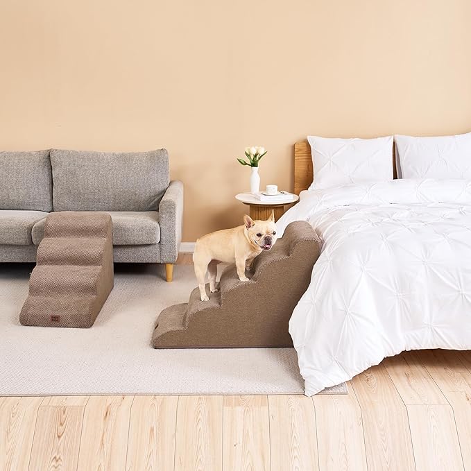 - SPECIFIC AND STEADY DESIGN - 33D density of pure foam make this stair more steady when your pets walk on. The dog bed stairs can provide strong support for pets in the walking process. Low angle slope design can better protect your pet's joints.