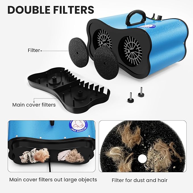 - Dual Motor & Adjustable Airflow -Provides powerful and stable airflow to help you with those furriest and thick coated friends. The dual motor provides stronger airflow than many dryers. Watts: 1600/Volts: 120V