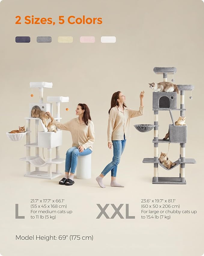 Feandrea Cat Tree, 66.1-Inch Large Cat Tower with 13 Scratching Posts, 2 Perches, 2 Caves, Basket, Hammock, Pompoms, Multi-Level Plush Cat Condo for Indoor Cats, Beige UPCT165M01