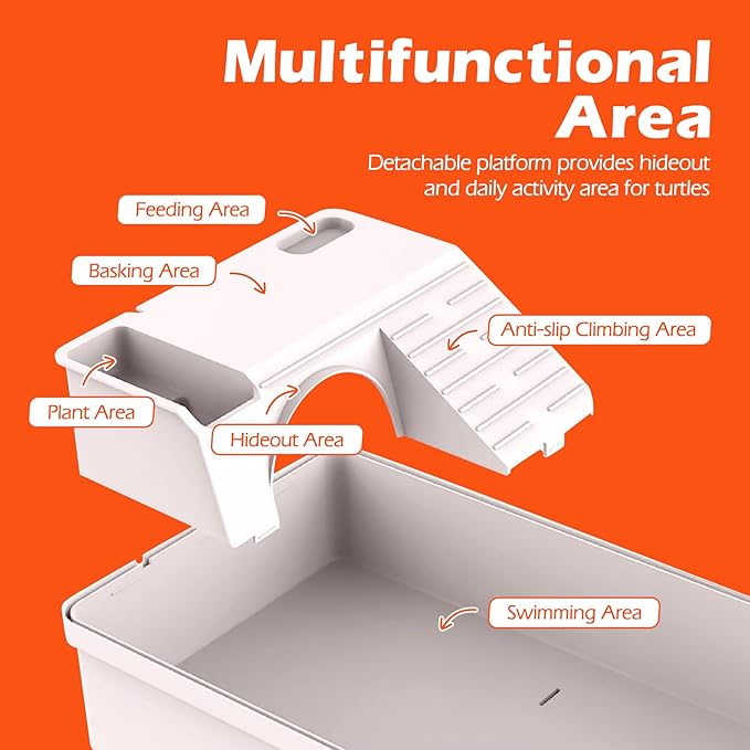 - Complete Accessory Package & Easy Cleaning: Includes turtle tank base, silent water pump, net, plants, UV basking lamp, and bulb. A built-in bottom drainage outlet makes water changes quick and easy, ensuring convenient and stress-free maintenance