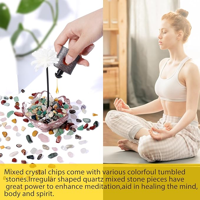 - 🌈【Mixed Crystal Chips Bulk】Assorted crushed stone chips come with various colorfoul tumbled stones.Irregular shaped quartz mixed stone pieces have great power to enhance meditation,aid in healing the mind,body and spirit.