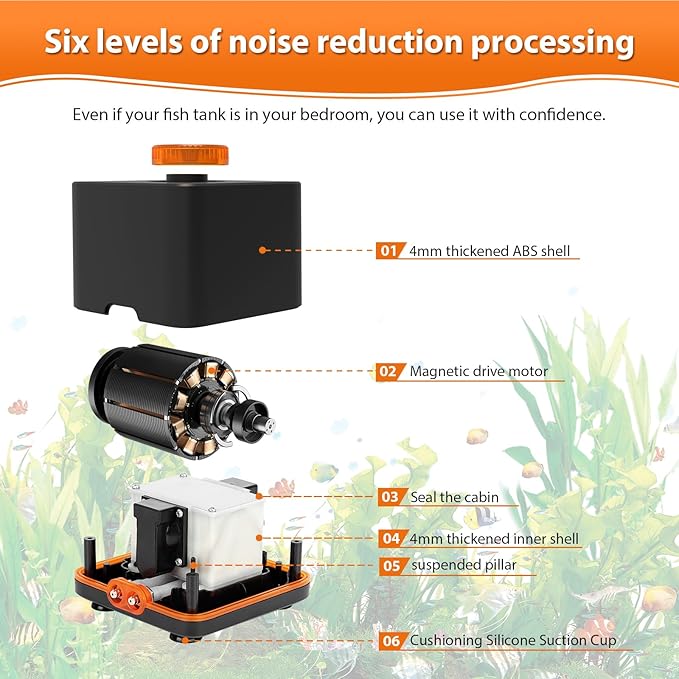 - Bedroom level mute effect:Bearingless motor works through magnetic bearings to reduce friction and thereby reduce noise. Four rubber feet reduce the contact between the motor and the casing, thereby reducing the transmission path of noise. The four suction cups firmly fix the air pump and provide sound insulation and shock absorption to achieve noise reduction. Even when used in the bedroom, it will not feel noisy