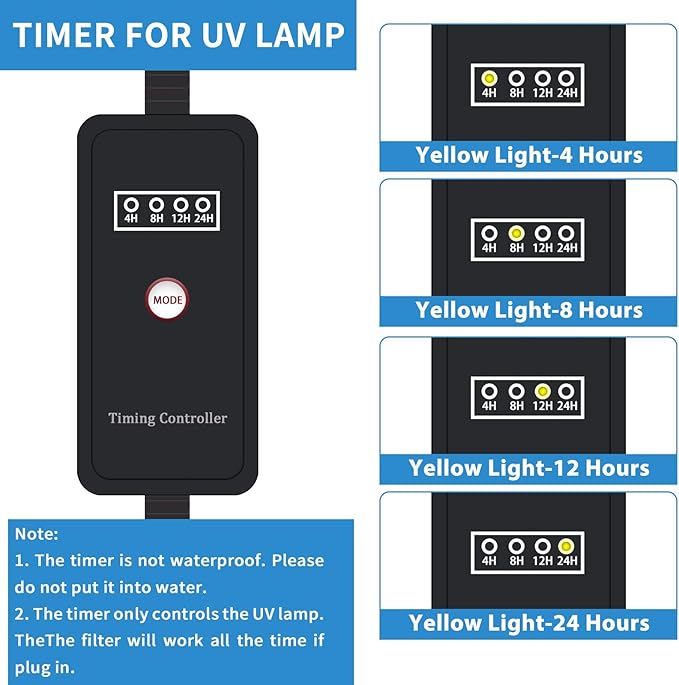 - 【Timer for U-V Light】A timer, which controls the U-V lamp to turn on at the options of every 4 hours, 8 hours, 12 hours, or 24 hours, provides you great convenience as it is not necessary to have the lamp on all the time. PS: The timer can only control the U-V lamp, not the water pump.