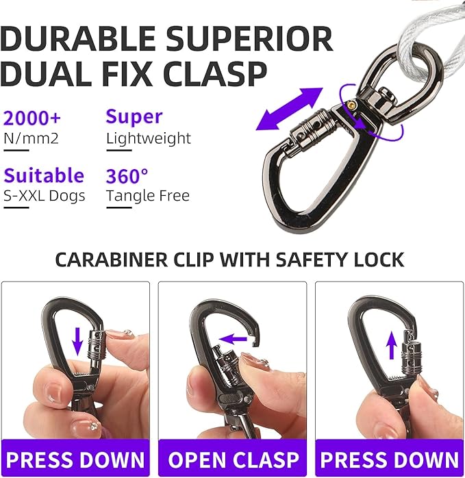 - Upgrade Heavy Duty Buckle & 360° Tangle Free-dog cable use heavy duty locking carabiner, stronger and more durable, with a 360° smooth rotation axis, your dog can run freely without getting tangled.