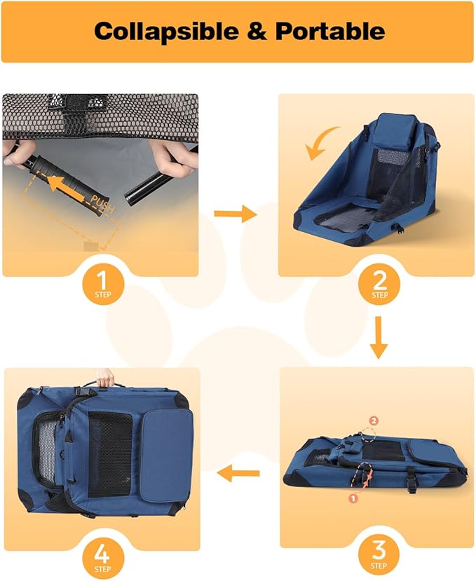 - 【2 Storage Pockets & 2 Portable Handles】The soft sided dog crate has side and top pockets to store essentials such as snacks and toys. The collapsible dog crate is easy to carry with the side handles, making it perfect for travel, transportation and daily walks.
