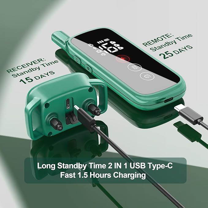 - Fast Charging & Long Battery: Heaflex dog shock collar with remote charges via USB Type-C in 2.5 hours. The receiver lasts up to 35 days on standby, and the remote up to 45 days. Enjoy extended usage with quick recharging for reliable training