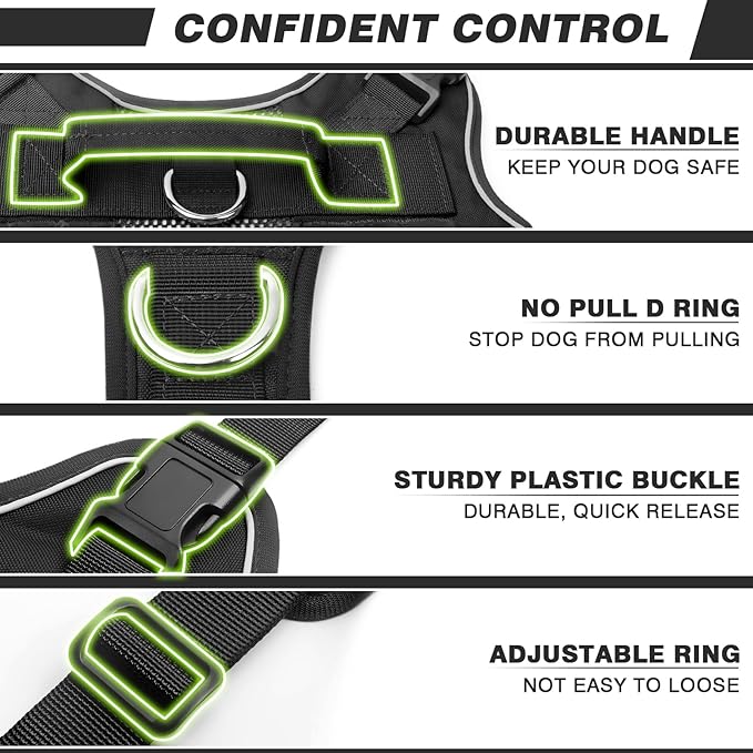 - 【4x Plastic Buckles + 2 D-rings】: Put on and take off this easy dog harness with 4 quick-release buckles from the side of the dog’s neck instead of the headwith no hassle. We also have adopted a widened design for the large dog. 2 stainless steel D-rings at the front chest and back for training, short and long leashes. This dog harness is made with military grade materials and reinforced stitching.