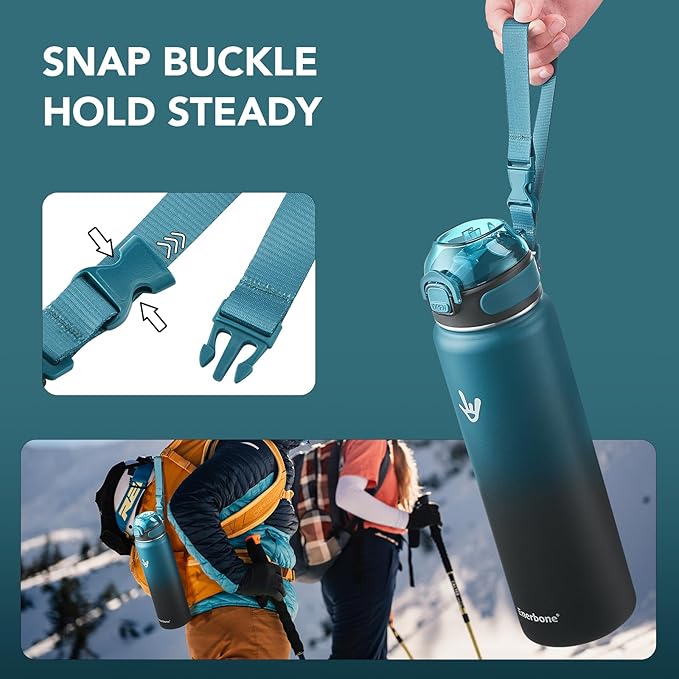- Easy Travel: With its generous 32 oz capacity, the water bottle with snap buckle is perfect for all your outdoor adventures, such as hiking, camping, and sporting events. Stay hydrated and enjoy your journey hassle-free with this versatile companion.