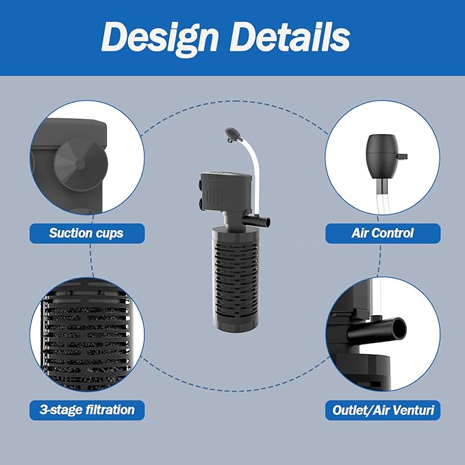 - SATETY MOTOR - This internal aquarium filter has an fully epoxy-sealed motor, tested with super high voltage during manufacturing to avoid electricity leakage.