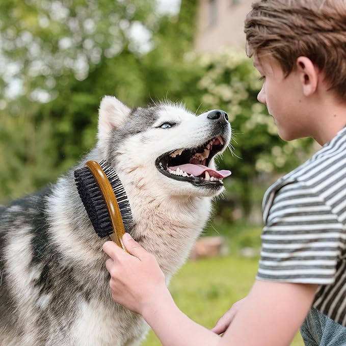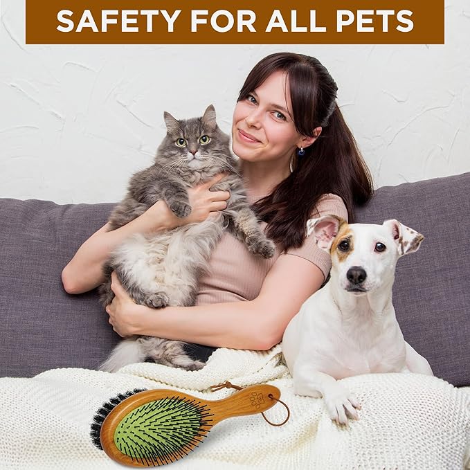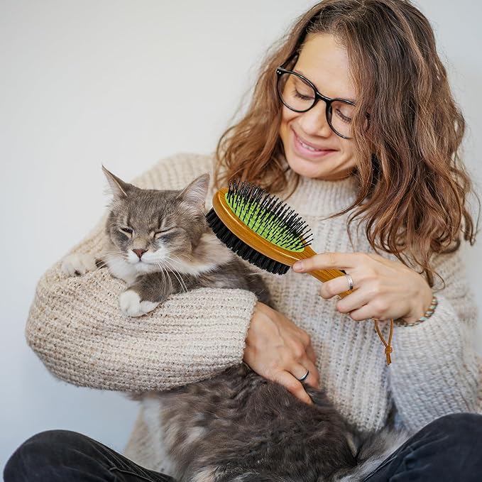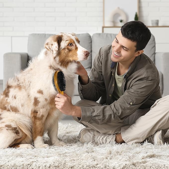 - Versatile 2-in-1 grooming solution: Simplify your pet care routine with this double-sided brush. One side features durable pins for effective detangling and removing loose undercoat hair, while the other offers gentle boar bristles for smoothing and adding shine.