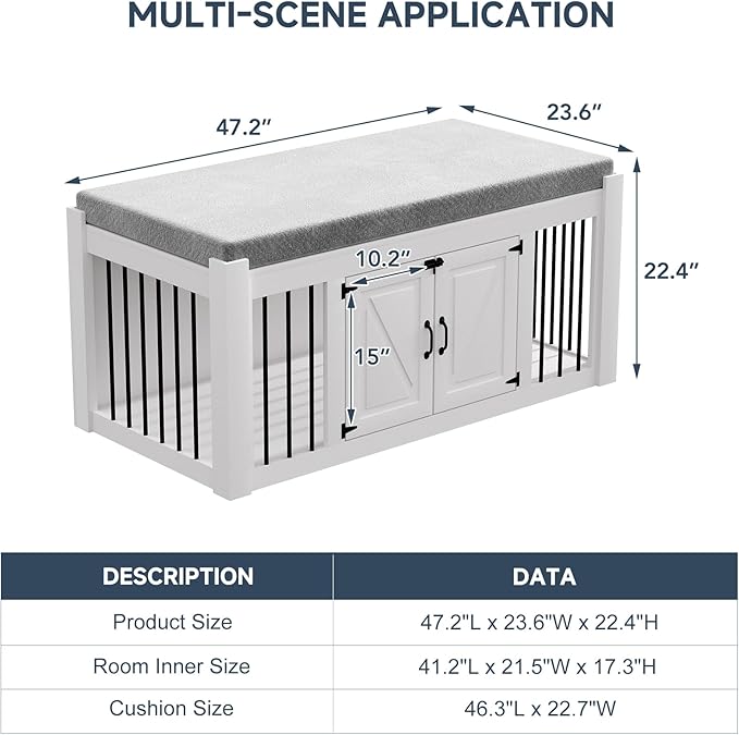 - EASY UPKEEP: This dog crate bench design focuses on your convenience. With a removable cushion and easily accessible doors, cleaning and maintenance are effortless, promoting a clean living space for your pet.