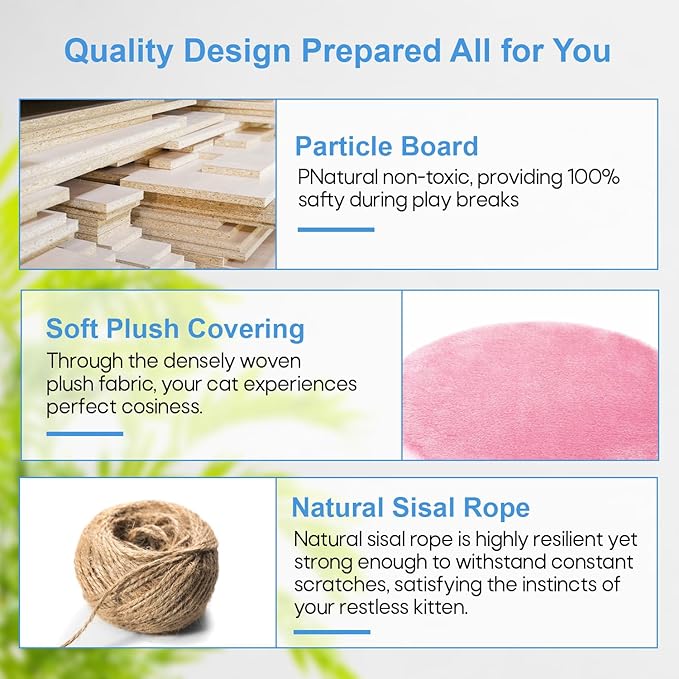 - 🐱 【Posts for Scratching Covered in Sisal 】These are scratching surfaces that are integrated into the framework. Cats love to bury their claws in sisal because it's a sturdy substance with a coarse texture. Our cat tree promotes healthy scratching habits and helps discourage cats from damaging furniture by offering dedicated spaces for them to scratch.