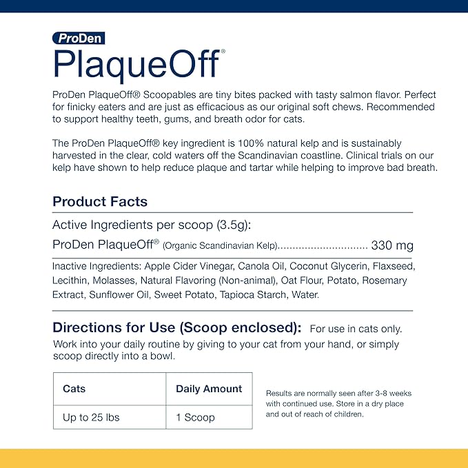 - Effective Plaque and Tartar Control - ProDen PlaqueOff Scoopables are formulated with 100% natural kelp, proven in clinical trials to reduce plaque and tartar buildup, helping your cat maintain optimal dental health.