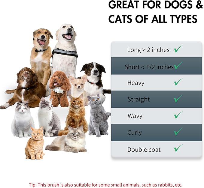 - Versatile Compatibility: Suitable for all breeds and sizes, big and small. our self-cleaning brush effectively tackles both long and short hair types. Its versatile design works wonders on smooth, curly, thick, heavy and silky coats, making grooming a breeze for pet owners and groomers alike.
