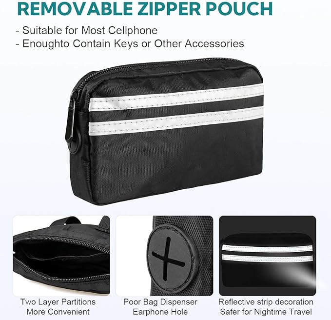 - Multifunctional Dog Walking Bag: This dog walking fanny pack has perfect size so, it's super nice to put your phone, poop bags, treats and house key in it while you are out about with your dogs and no bulging! Get ready to have the best time with your dog with the attached bag in a dog running leash hands free! Enjoy a hands-free walk, run experience with your furry friend!