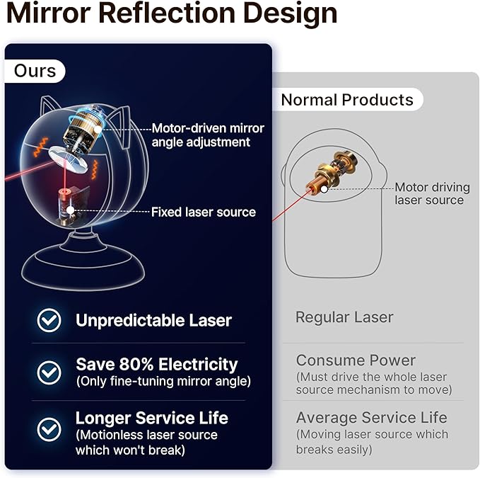 - Ultra-long Battery Life - We achieve random laser movement by fine-tuning the mirror angle, which saves 80% more energy compared to using a motor-driven laser source. It lasts 5-10 days regular playtime per charge. Supports usage while charging for unlimited operation, no hassle of frequent recharging