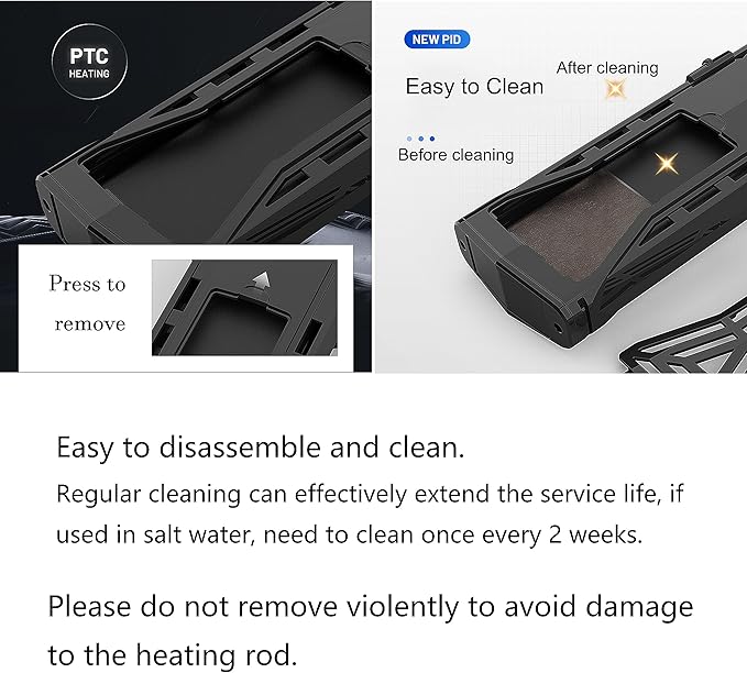 • PTC,Ceramic core.Corrosion resistance,easy to clean,PTC , keep 1 month cleaning once, for salt water ,keep 1 month cleaning twice,can greatly extend the service life of the heater.