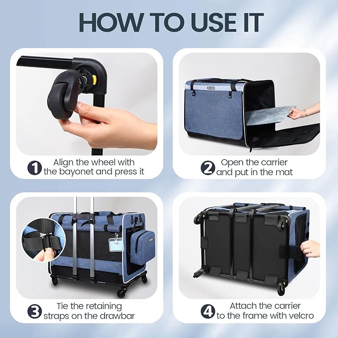 - 【360° ROTATION WHEELS】Velcro on the bottom of the large pet carrier wheels and a strap on the handle make it easy to attach the bag to the wheels. And four 360° rotation wheels can ensure a smooth and comfortable riding experience for the rolling cat carrier on uneven road surfaces or grass.
