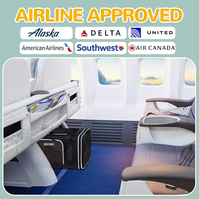 - 【AIRLINE APPROVED CARRIER 】Unfolded size:(17+3)"L×11"W×9.5"H, Petskd pet carrier is airline approved and can be placed under the seat in the cabin, it is mainly designed for ①Alaska Airlines, but also in compliance with ②Southwest Airlines ③Delta Airlines ④United Airlines ⑤American airlines ⑥Air Canada. We recommend you buy this carrier when you fly with the above-mentioned airlines.