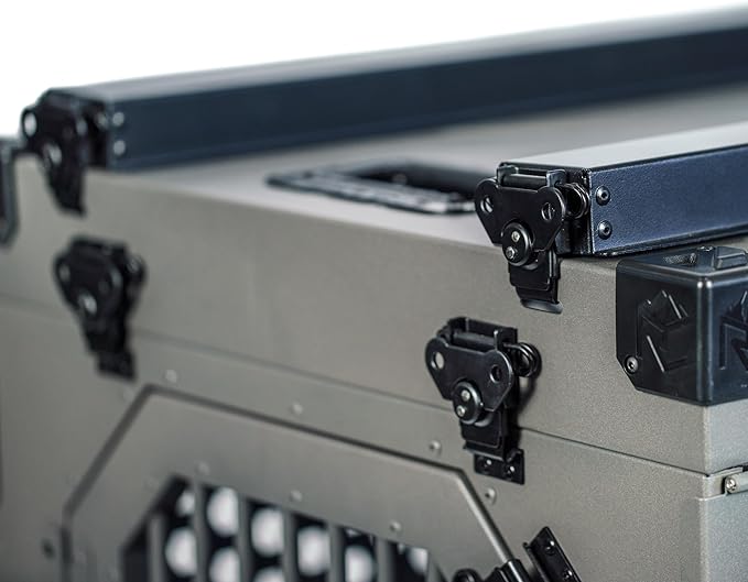 - STACKABLE AND SECURE: Our crates feature durable corners that allow like sizes to be stacked on top of each other, whether in the upright or collapsed position. The overbuilt doors provide increased ventilation, visibility, and airflow, giving you peace of mind with standard butterfly latches, two panels of aircraft-grade aluminum, welded inside and out, and solid aluminum bars. This design ensures your pet's comfort and security at all times.