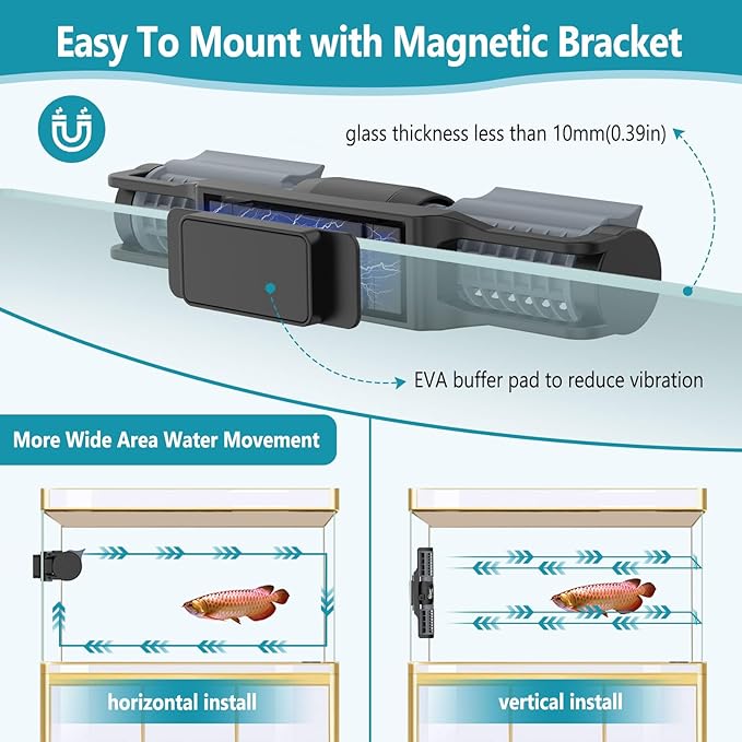 - 24V DC Magnetic Powerhead: Power 18 watt, use DC 24V working voltage, stable and safety. Come with a magnet bracket is strong enough to install securely on the 10mm thick tank. Recommend for 40 -125 gallons aquarium up to 31" in length