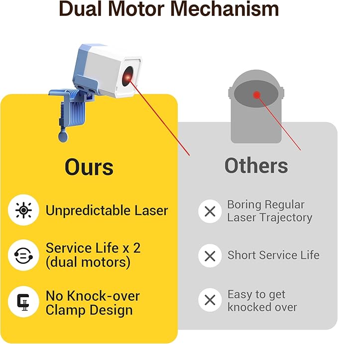 - True Randomness: Experience the game-changer in cat toys with truly random laser movements. No more predictable patterns; watch your cat or kitten get fully engaged in the hunt, thanks to the cutting-edge dual motor mechanism.