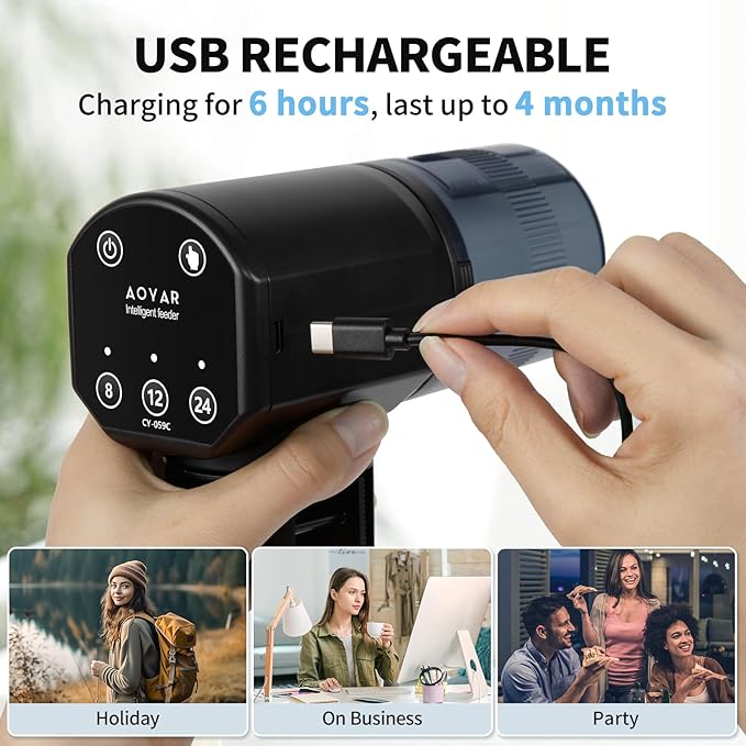 - 【Easily Setup & 3 Kinds Smart Interval Feeding Modes】The Aoyar automatic fish feeder has 3 fixed feeding modes,just press the button on the settings page,it will automatically rotates feeding every 8/12/24 hours.Easily operation.You also can feed fish at any time via manaual modes ,enjoy the fun of feeding fish in your leisure time.(Small fish are recommended feeds every 24 hours).