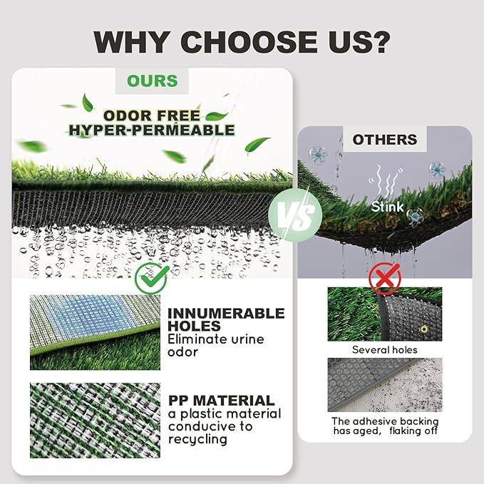 - Machine Washable & Ultra-Absorbent Artificial Grass & Odor Free : The upgraded dog potty grass pad is ultra-absorbent and odor free. The knitted and melted bottom permit urine to instantly flow into the plastic tray below and reduce urine stink.